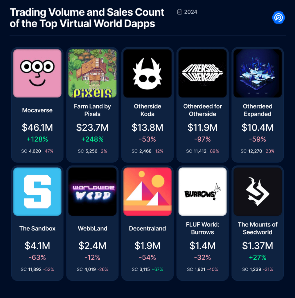 区块链数据分析机构DappRadar发布《2024年度游戏产业报告》,重点推介本年度最具行业影响力的两大元宇宙项目:数字身份协议Mocaverse与链游平台Pixels,二者通过差异化生态构建策略实现用户规模与商业价值的双重突破。