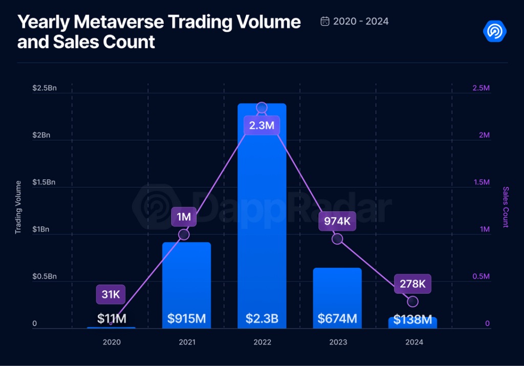 根据DappRadar数据,2024年元宇宙NFT项目的交易额与销售数量均跌至2020年以来最低水平,交易量同比骤降80%,销售量较上年同期暴跌71%。