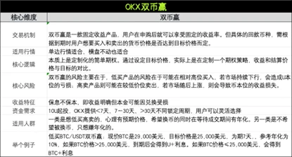 双币赢适合那些不确定市场方向,但希望赚取收益的持币党、不愿意高频交易等用户。双币赢是 OKX 打造的一款“保息不保本”的结构化产品,可以帮助用户在按照目标价买入或卖出数字货币的同时赚取额外收益。用户可以通过申购双币赢,进行主流币对进行交易,例如 BTC - USDT、ETH - USDT),从而享受任一币种的稳定收益。但值得注意的是,触发行权后可能换成另一种资产。为此,OKX 上线 ETH/BTC 币本位双币赢,支持 BTC 和 ETH 投入申购,实现低买高卖。较 U 本位双币赢提供全新收益赚取方式、 0 费用实现两大加密货币之间的转换、持续生息、以及无惧转化为 USDT 而错过行情等核心亮点,助力用户无忧持币。
