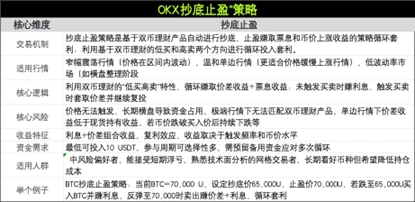 OKX 抄底止盈策略是基于双币理财产品自动进行抄底、止盈赚取票息和币价上涨收益的策略循环套利:利用基于双币理财的低买和高卖两个方向进行循环投入套利。U 本位收益:投入 USDT,用双币理财低买,低买成功之后,再进行止盈,赚取币价差异的同时获得利息收益。该策略目前仅支持 BTC 和 ETH,但系统可以根据用户的目标价格、最低年化、以及最大投入期限灵活匹配。此外,OKX 抄底止盈策略提供普通模式、与进阶模式两种。普通模式的价格设定为固定绝对值,比如 75, 000 USDT,适用于明确支撑/压力位的场景,灵活性低。进阶模式的价格设定为动态比例,比如市价下跌 5% ,适用于无明确点位但预判波动比例的场景,灵活性高。