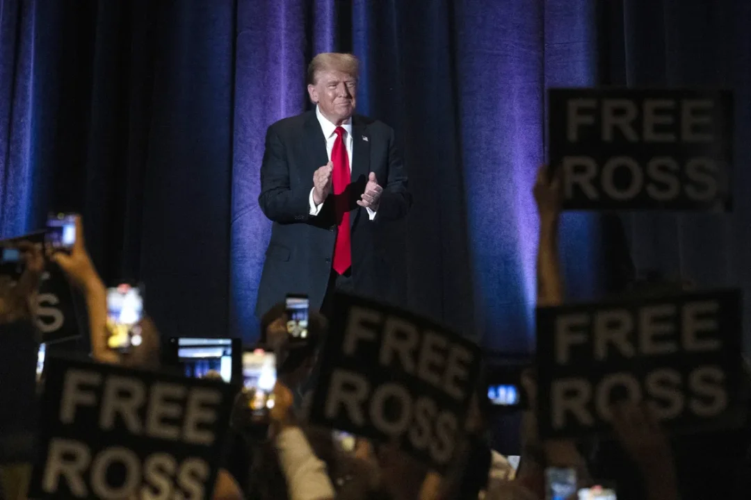 特朗普去年在一个会议发表演讲时,听众举着写有 「释放 Ross」 的标语。来源:法新社