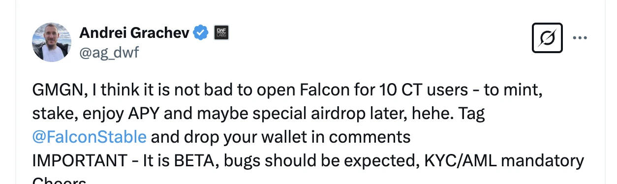 项目简介: 由 DWF Labs 合伙人 Andrei Grachev 推出的合成美元稳定币协议,现处于内测版,需要申请才可以有资格参与(关注其 X 账号,会不定期抽内测资格,提前存款享高 APY 和潜在空投)。具体参考《 年化 22.6% ,DWF 合伙人力挺的 Falcon Finance 如何实现高收益 》