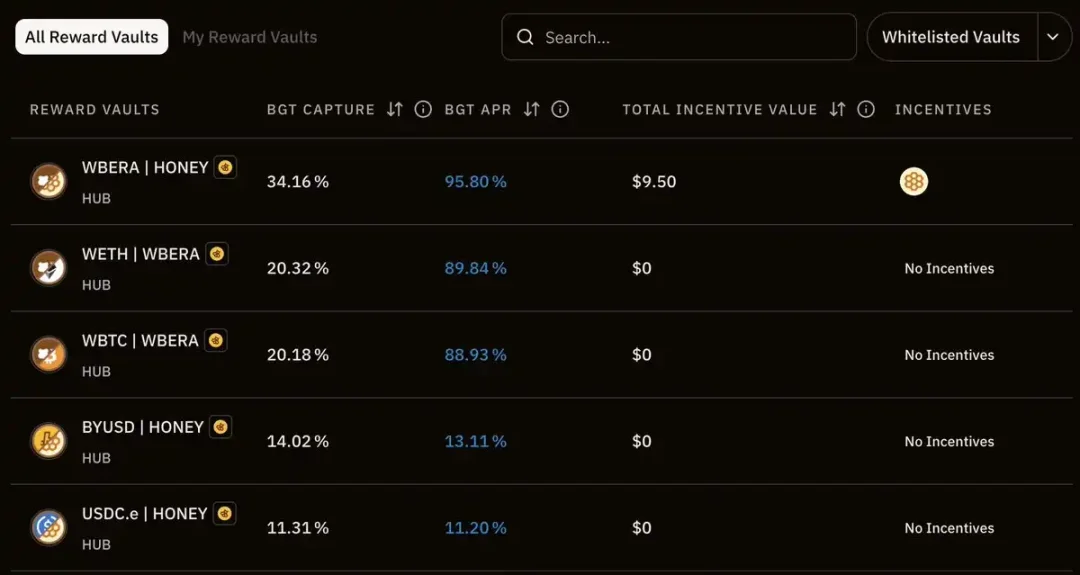 例如,用户可以在原生 DEX 的某些流动性池中提供流动性,以赚取 LP 交易手续费。然后,通过将 LP 代币存入特定交易对的 DEX 奖励金库,用户可以在 LP 费收益的基础上额外获得 BGT 增发奖励。