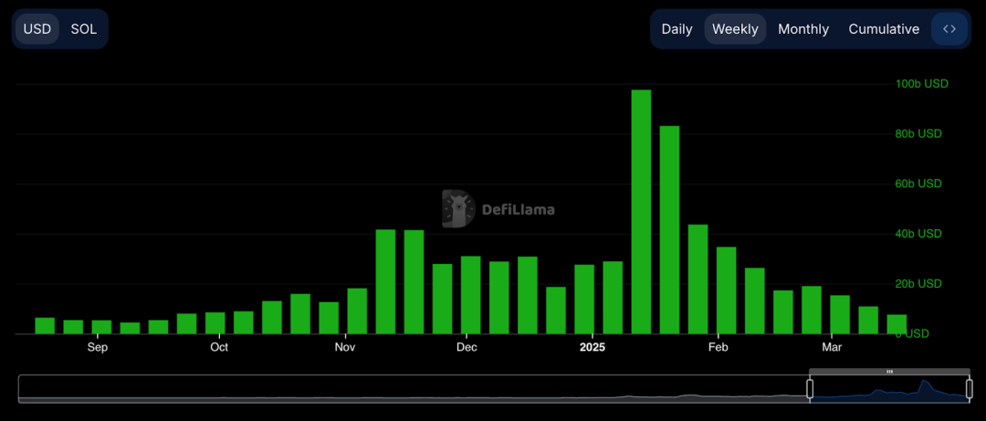这样一个提案的背景,是 Solana 在 Trump 发币后,逐渐从 Memecoin 带来的链上狂潮归于平静的阶段。周交易量从年初接近 $100b 回退到不超过 $10b,下降 90%,已低于 Memecoin 兴起初期的交易量。