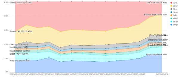 以近期爆发的Mubarak(MUBARAK)为例,Gate.io于3月14日全球首发上线该代币,首日最高涨幅达7400%,单日交易量突破4.7亿美元,占据CoinMarketCap全网成交量的63%。而币安在筹备上架评审时,Gate.io用户已通过现货与合约联动策略完成首轮70倍收益收割。另一案例是AO(AO),Gate.io在3月19日开启HODLer空投活动,用户持1GT即可瓜分3,333.33枚AO代币,其现货交易上线后迅速吸引市场关注,进一步巩固了平台作为“币安前一站”的战略定位。