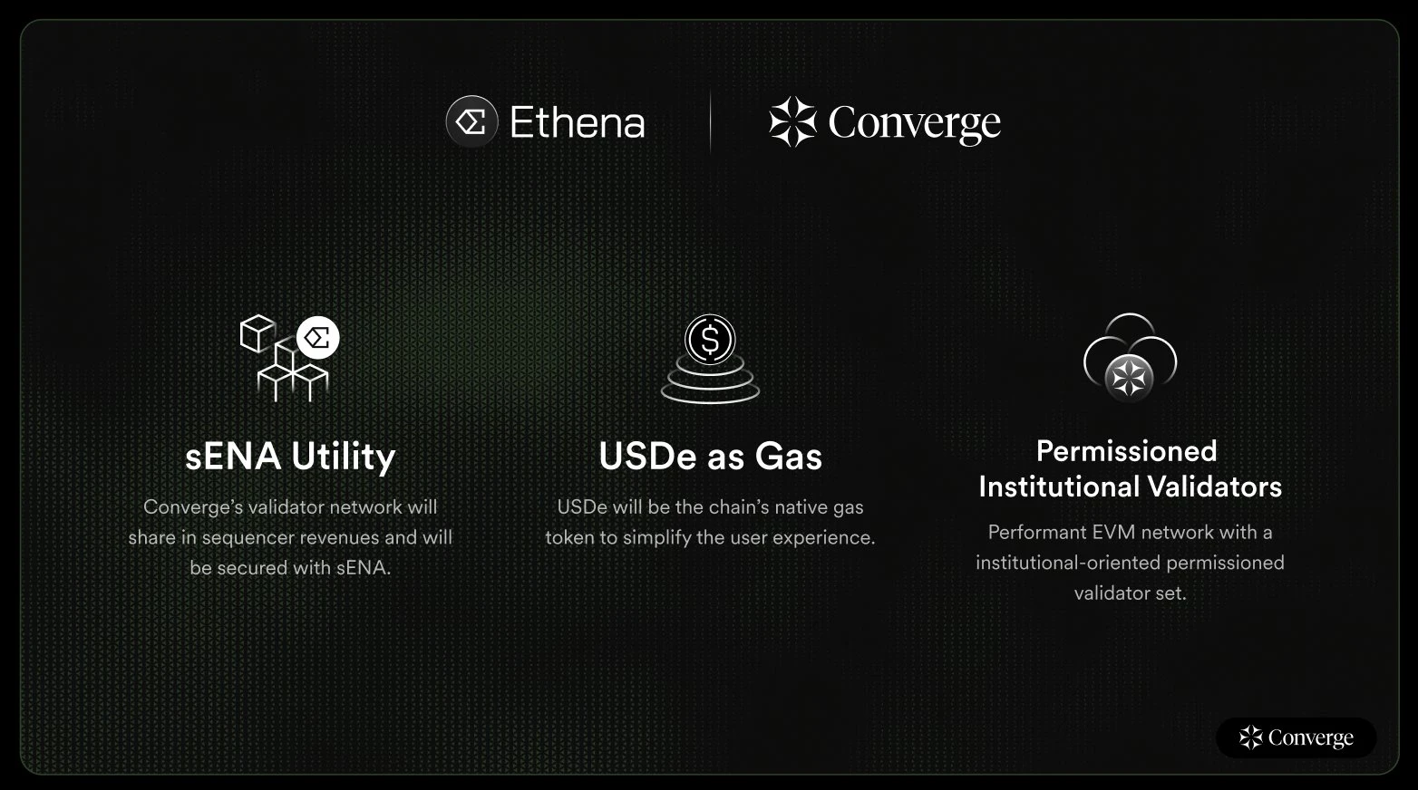 Converge 预计将在今年第二季度上线主网。验证者系统将使用 ENA 代币进行质押和交易验证。同时,USDe 和 USDtb 将作为网络上的交易费用代币。
