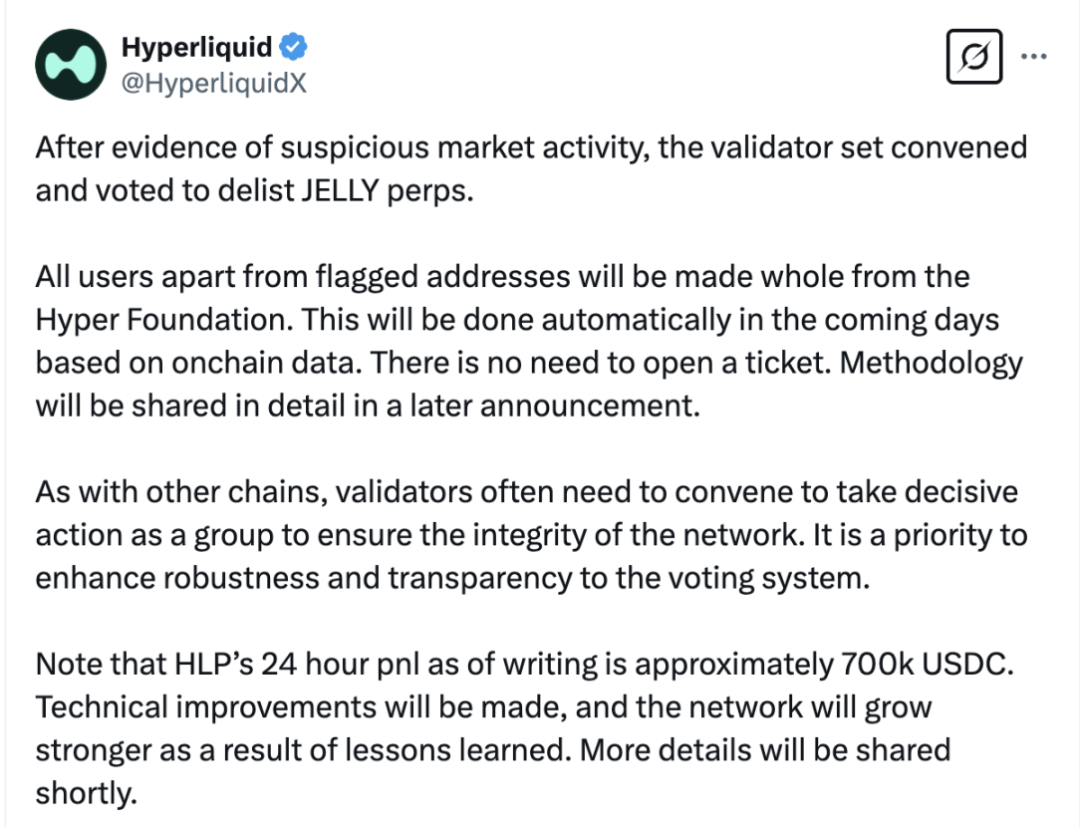 过了20分钟,官方姗姗来迟,发出公告给予解释,其表示在事件发生后,验证者投票下架了JELLY合约,但除了这一违规地址外,参与JELLY交易的用户将由Hyper Foundation全额补偿。值得注意的是,由于开单价即结算价,而Hyperliquid接手的价格是0.0103美元,金库在此笔交易中还赚取了70万美元。