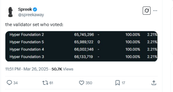 从公告的言外之意来看,Hyperliquid无疑想凸显出平台符合去中心化治理原则,是经过投票决定了代币下架。然而,对于这一回应,市场却并不买账。归根结底,Hyperliquid的中心化治理早已声名在外,从名列前茅的HYPE 质押者来看,前5位都是Hyperliquid基金会的成员。而根据X用户spreekaway的爆料,本次投票验证者仅有Hyperliquid基金会,也让市场对于这一以“去中心化”为理念的交易所表示不满。市场更是作出梗图进行回应,讽刺Hyperliquid验证者只有创始人一人。