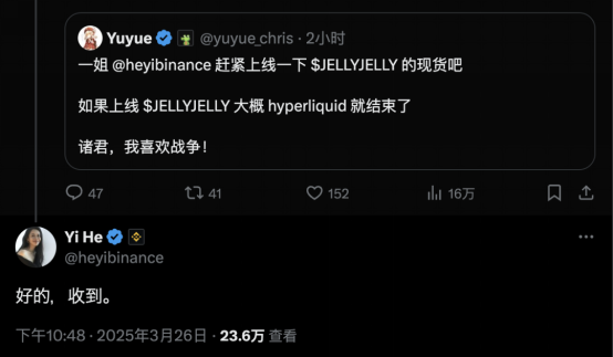 对于Hyperliquid而言,这还不是最糟糕的,只要价格停止上涨,虽有亏损,但尚可在相对容易接受的范围。然而,屋漏偏逢连夜雨,头部交易所们突然联合出手上线JELLYJELLY。23点10分,OKX交易所宣布将于23:30分正式上线JELLYJELLY永续合约交易对,而就在几分钟之后,币安交易所也宣布上线JELLYJELLY永续合约。