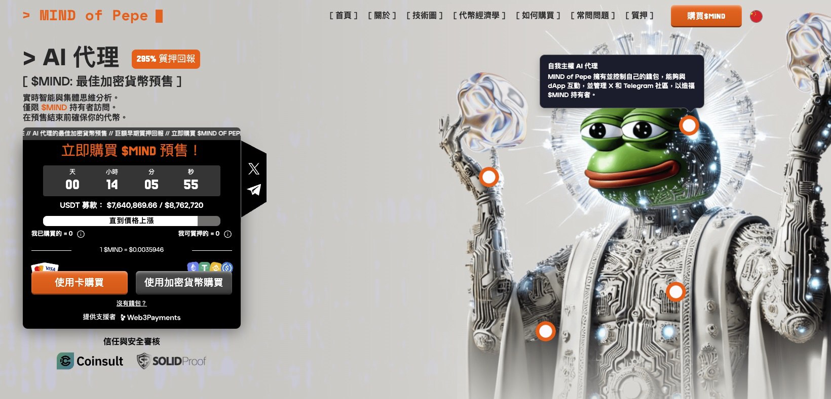 MIND of Pepe($MIND)是一款结合人工智能和Meme文化的创新代币,当前预售已筹集750万美元,现售价格$0.0035946。