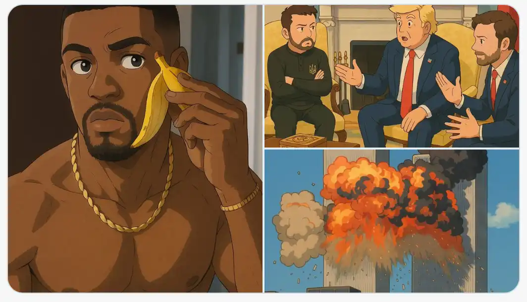 昨晚至今晨,X 等社交媒体平台上突然涌现出大量与宫崎骏影视作品风格极为相似的各式 meme 图片,比如下面这张在互联网上依然十分流行的「超级通用」梗图,在宫崎骏的「吉卜力风格」渲染下,又有了一番新的韵味和生机。