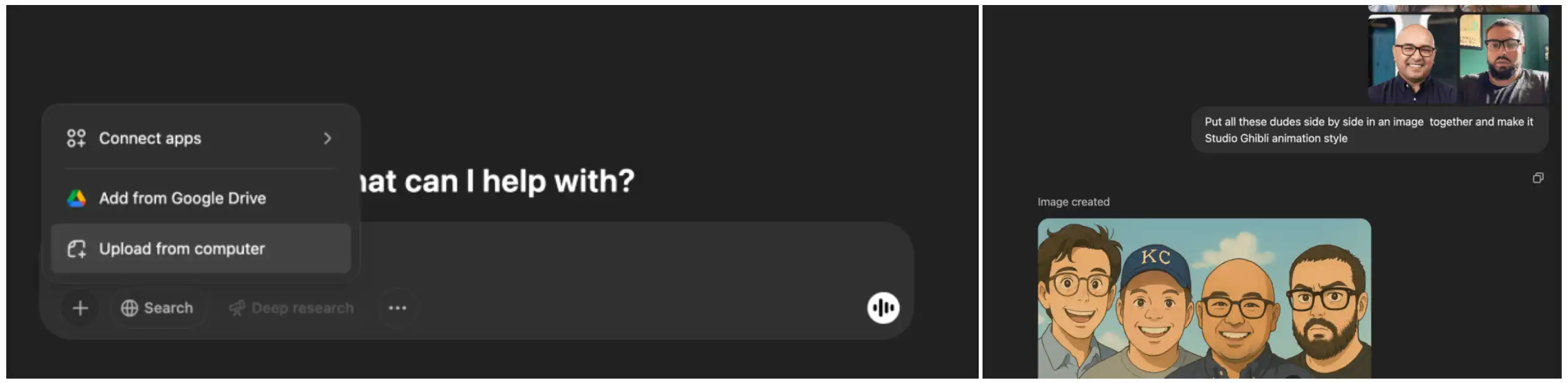 使用及时输入文本框的左下角的「+」按钮上传图像,然后便可以向具有图像创建模型的新的 GPT-4o 说「以吉卜力动画风格重画这张图片」。你也可以将多张图片上传,并通过吉卜力风格将它们组合成一张图片。总之尽管多多尝试,4o 会给你带来不少惊喜。
