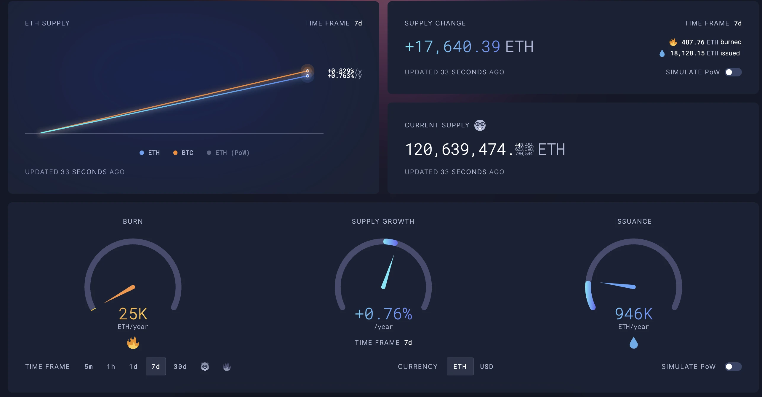 根据 ultrasound.money 数据,考虑到过去 7 天的销毁速度,预计 ETH 的供应量每年将增长 0.76% 。