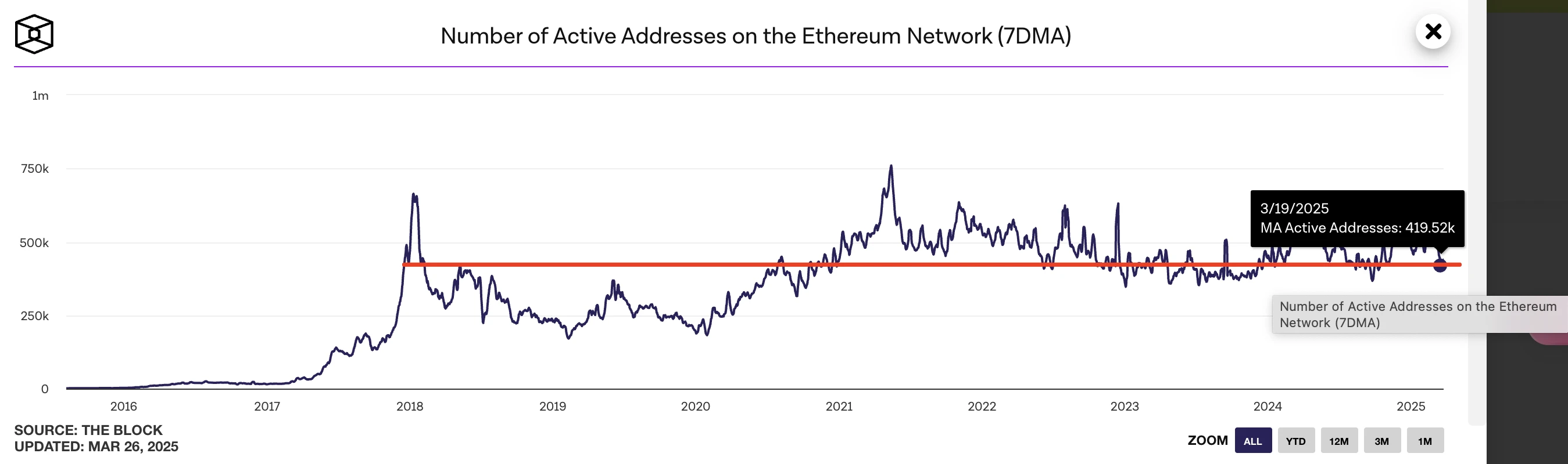 据 TheBlock 数据,以太坊网络 7 日平均活跃地址数于 3 月 19 日下跌至 41.9 万个,创 2025 年以来最低点;与 2024 年 10 月活跃地址数持平。