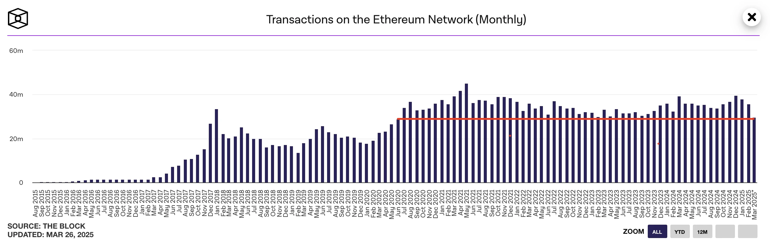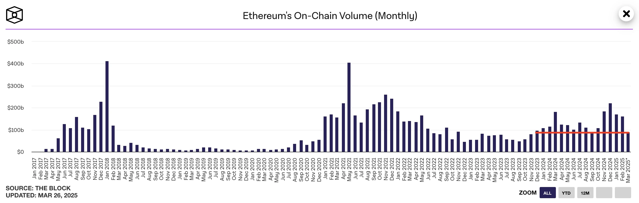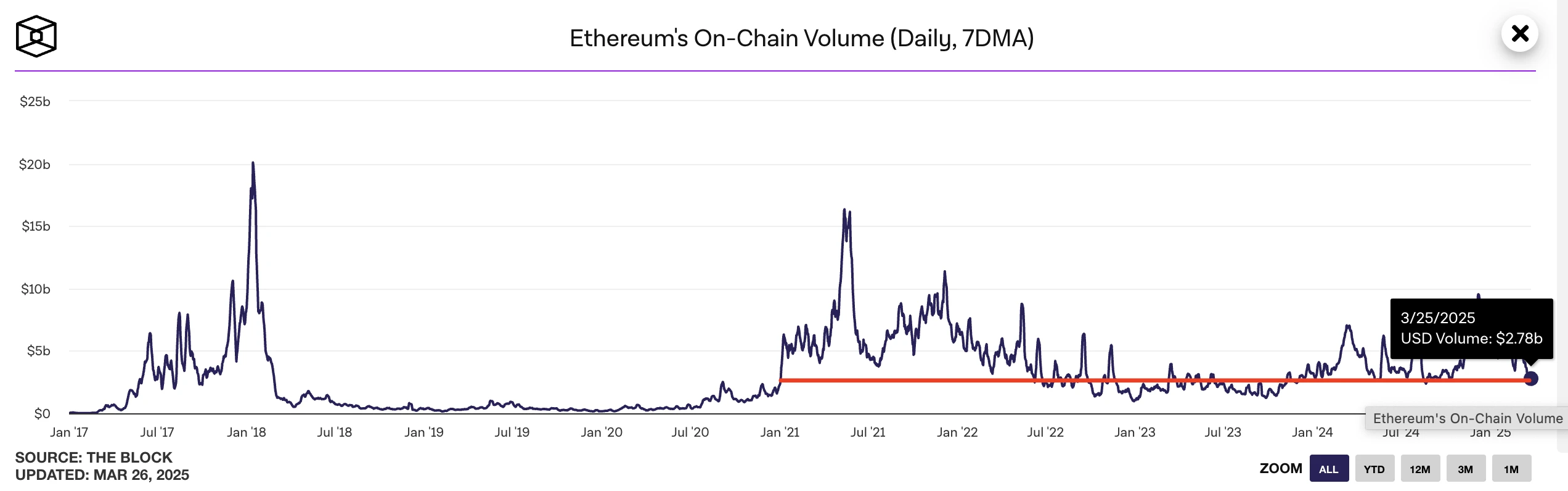 根据 TheBlock 数据 , 3 月 25 日,以太坊链上交易量约为 27.8 亿美元,约为 2024 年 8 月同期水平。
