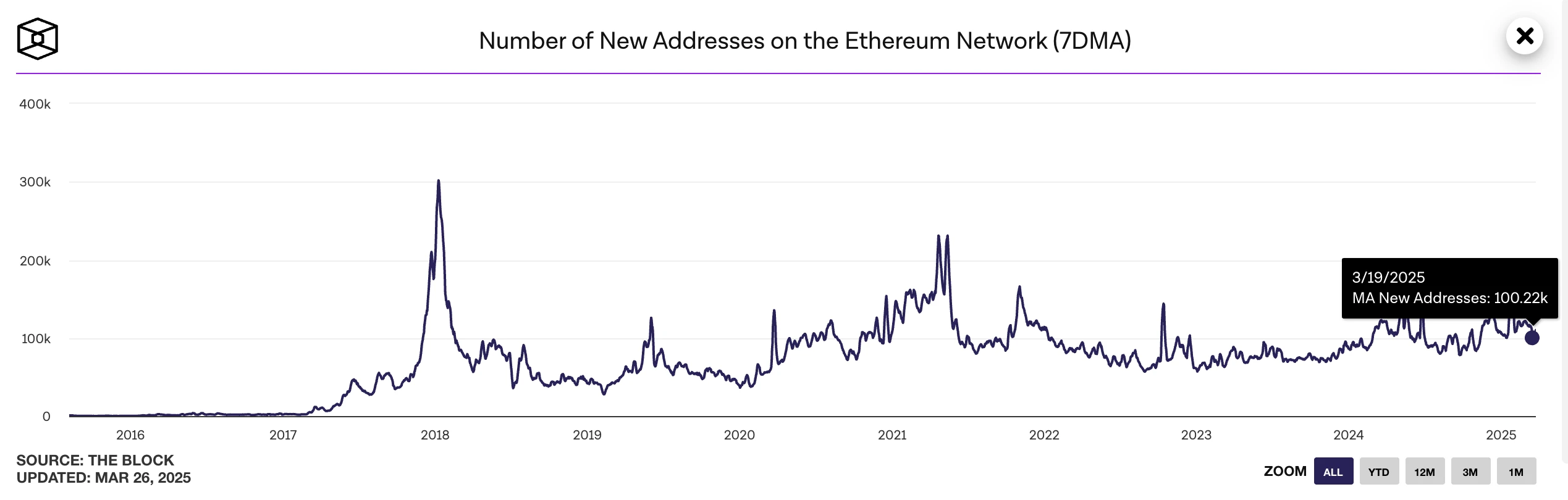 以太坊网络 7 日平均线新建地址降至 10 万量级