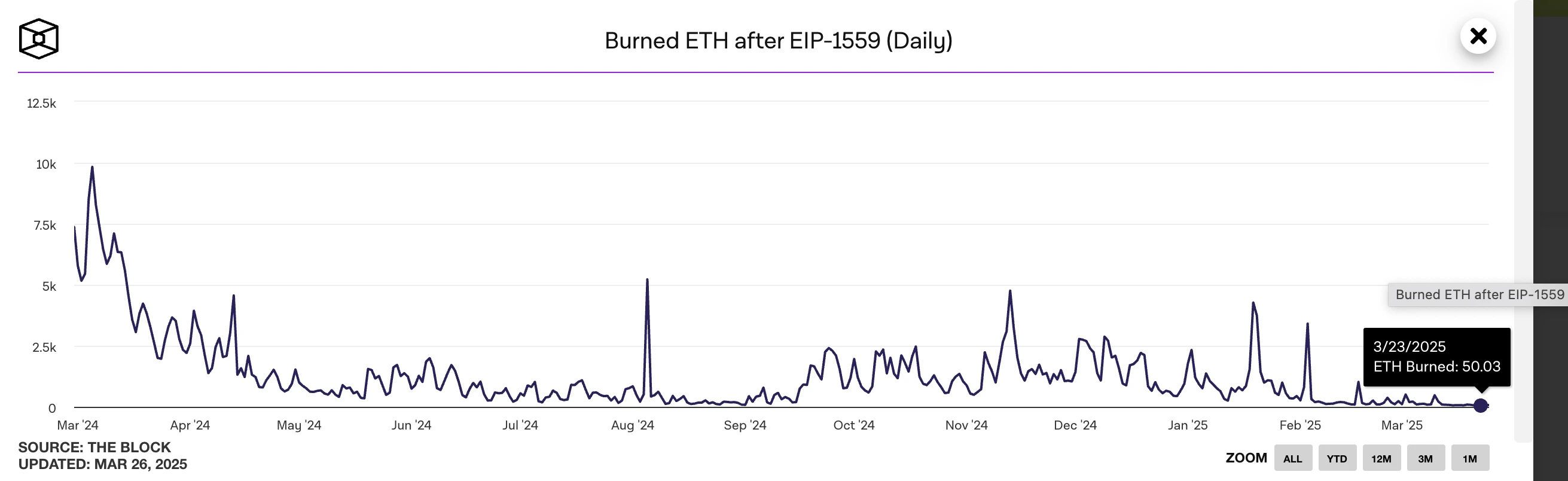 3 月 22 日, 以太坊网络单日仅销毁 53.07 枚 ETH ,价值约 106, 000 美元; 3 月 23 日, 以太坊网络单日仅销毁 50.03 枚 ETH ,续创历史新低。
