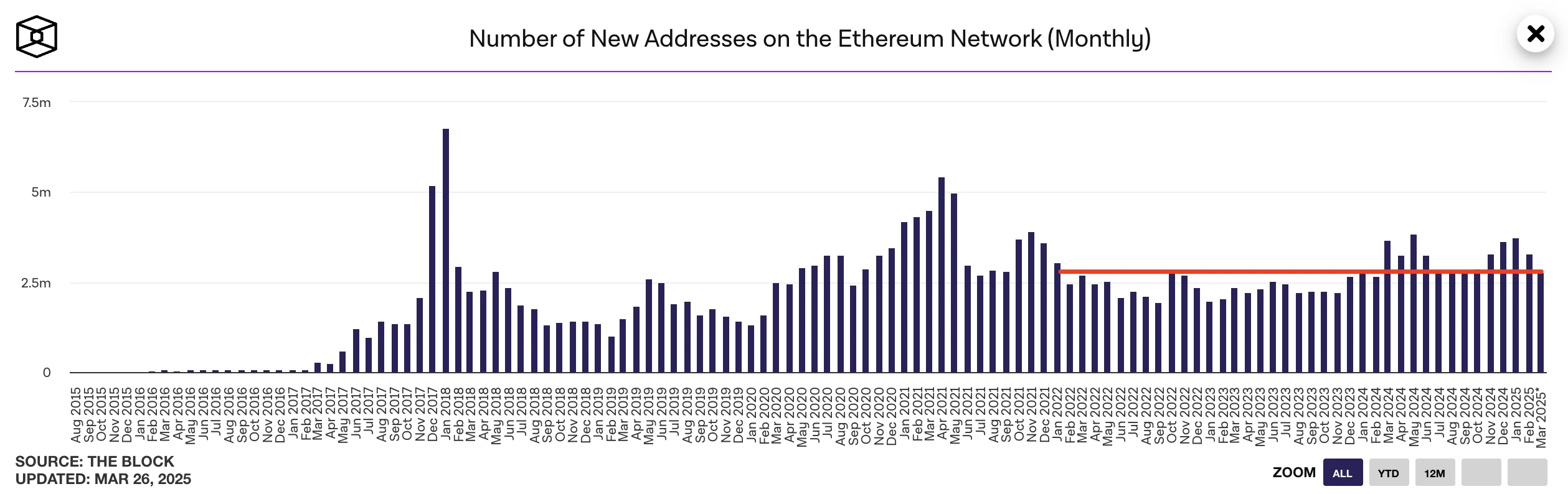 据 TheBlock 数据 ,截止 3 月 26 日,以太坊月度新增地址数约为 275 万个,与 2024 年 10 月前水平相当;略高于 2024 年 2 月。