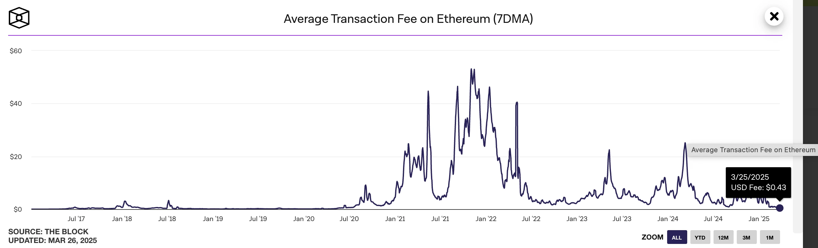 以太坊平均交易费成本较历史高点下降超 99.1%
