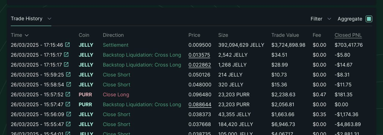 但在结算时市场上JELLYJELLY的现货价格应该是0.05美元左右,相差逾5倍。这种操作显然不符合常理。似乎,Hyperliquid通过人为介入,只是粗暴地关闭了这个亏损订单。