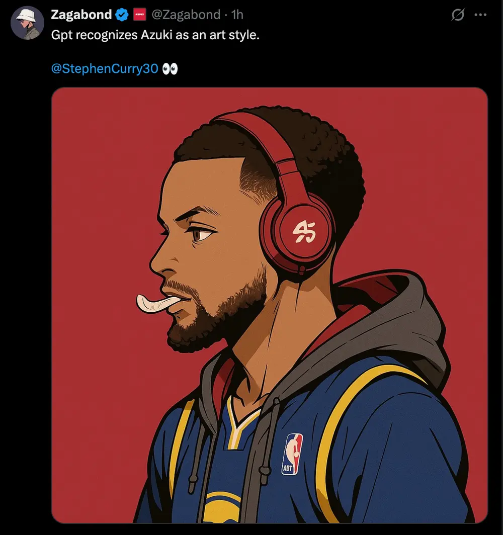 在 GPT-4o 图像生成图像功能上线之后,仅需上传一张 NFT 图像并输入“吉卜力风格”或“赛博朋克化”的指令,AI 便能瞬间将其转化为全新的视觉形态。当然,你可以将库里头像变成一种Azuki风格。那么,当下 AI 的发展将会对 NFT 产生怎样的冲击和影响?