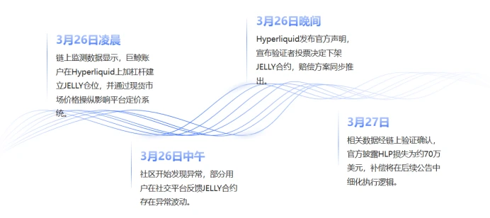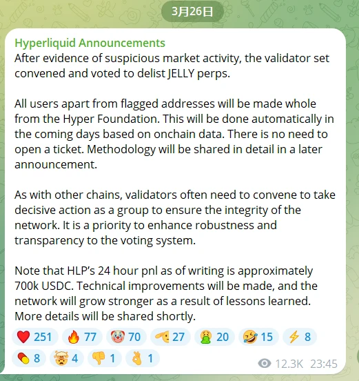 一场由鲸鱼账户主导的价格操纵行动,引爆了 $JELLY 永续合约的异常波动,平台流动性池(HLP)因此面临高达 2 亿美元的潜在风险敞口。危机发生几小时后,Hyperliquid 迅速通过验证者委员会投票决定下架相关合约,并承诺由基金会自动全额补偿非违规用户。