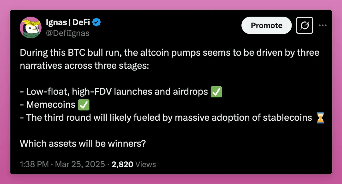 如今许多人认为,下一轮山寨币暴涨将由机构资金加速入场推动,尤其是稳定币。