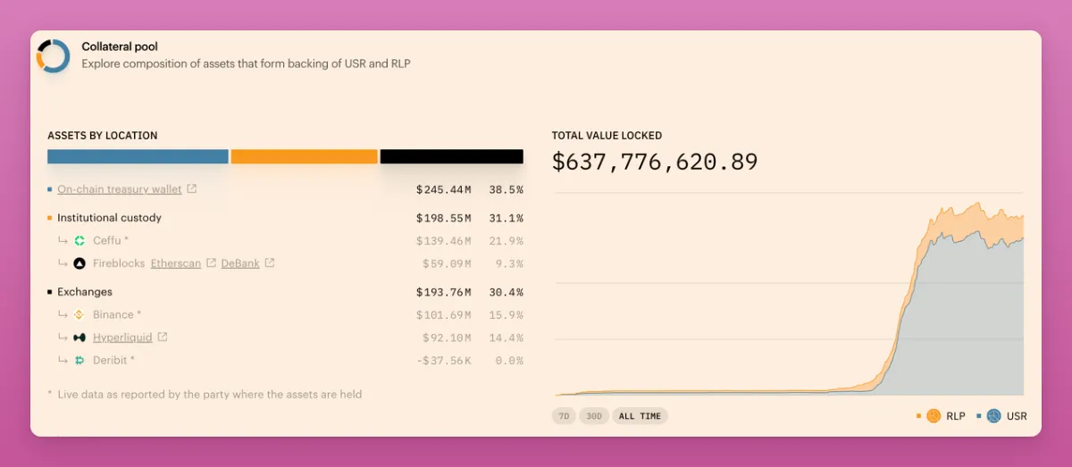 这一机制使风险偏好型用户能够获得更高收益,同时保护稳定币用户免受市场风险影响。截至本文撰写时,USR(稳定收益储备)提供4.3%的年化利率,RLP(风险流动性池)则提供6.7%的年化收益率。