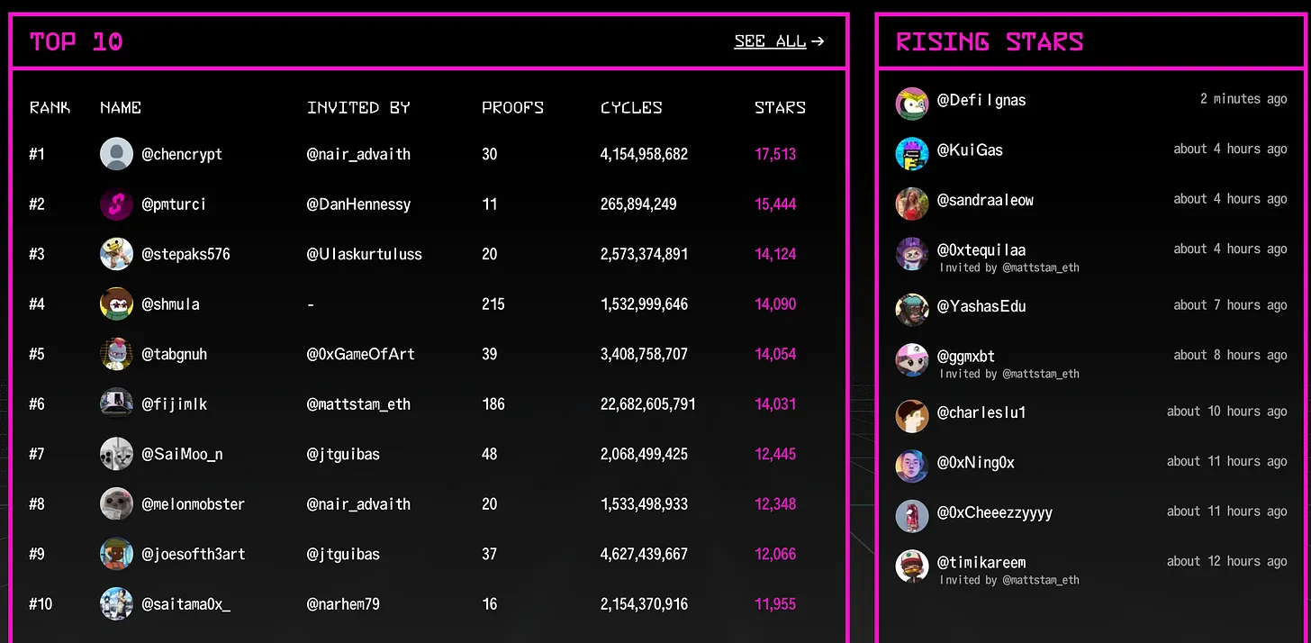 他们的测试网——第一阶段:信任危机,已于两个月前上线。用户通过生成零知识证明来获取星标奖励,但需支付10USDC覆盖证明生成成本。值得注意的是,邀请码需要通过积极参与Twitter、Discord等社区互动才有机会获取。