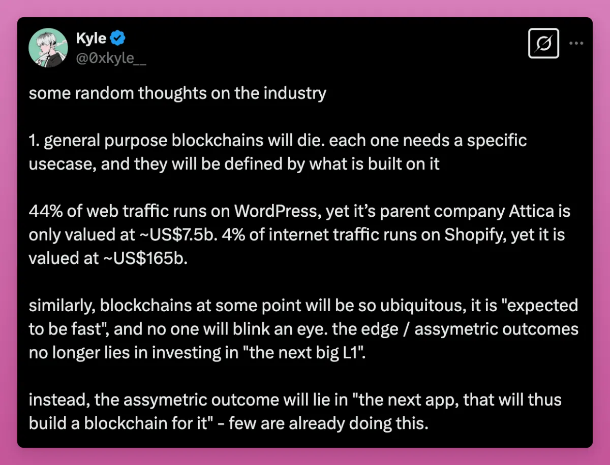 我对Fogo、Initia等新兴区块链最大的担忧在于它们能否真正获得市场采用?究竟会有哪些杀手级应用在这些链上诞生?正如Kyle所言:“通用型区块链将走向消亡。每条链都必须有明确的应用场景,而这些场景将由链上构建的内容来定义。”