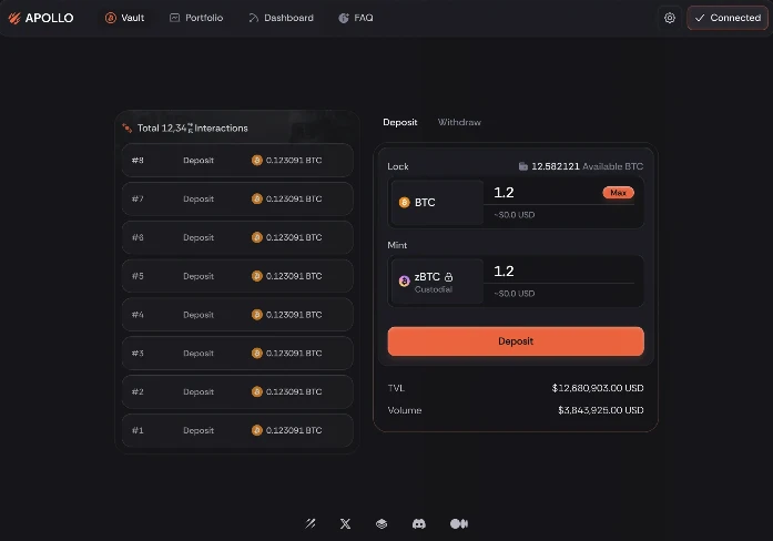 在推出之前,APOLLO 已经有了较高的采用率,链上交易量超过 4000 万美元,并在 Solana 上铸造了 50 枚 zBTC。这些里程碑凸显了 APOLLO 能够通过提供透明、安全且无需信任的平台来克服传统包装版比特币解决方案的局限性,从而为 Solana 带来真正的比特币流动性。