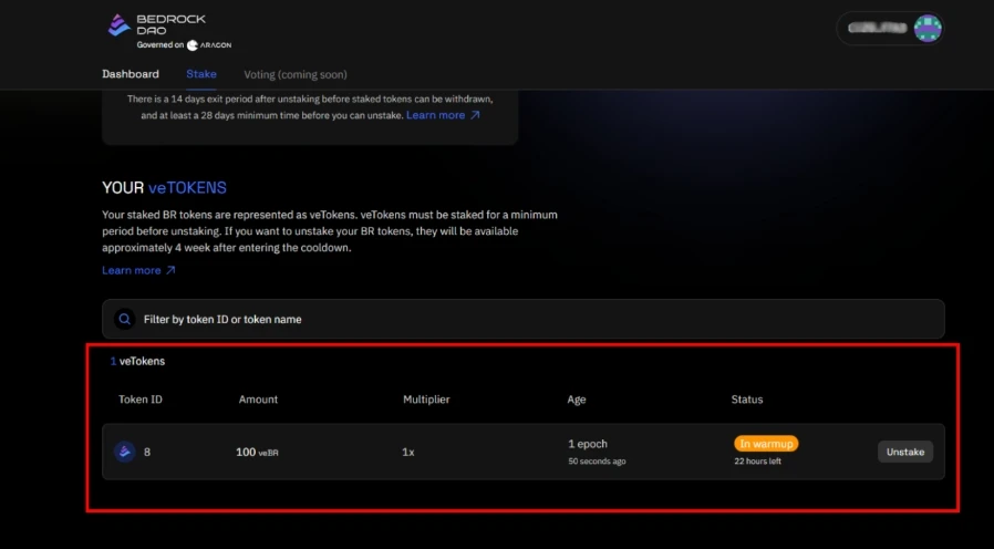 一旦质押确认,你将看到你的质押位置列在“你的 veTokens”部分下。每个质押都以一个 veToken 的形式表示,其中包含代币 ID、质押数量、乘数、质押时长和状态等详细信息。