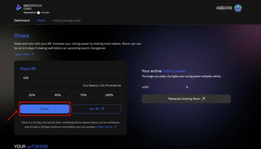 输入你想要质押的 BR 数量。准备就绪后,点击“质押”按钮,并在你的钱包中确认交易。