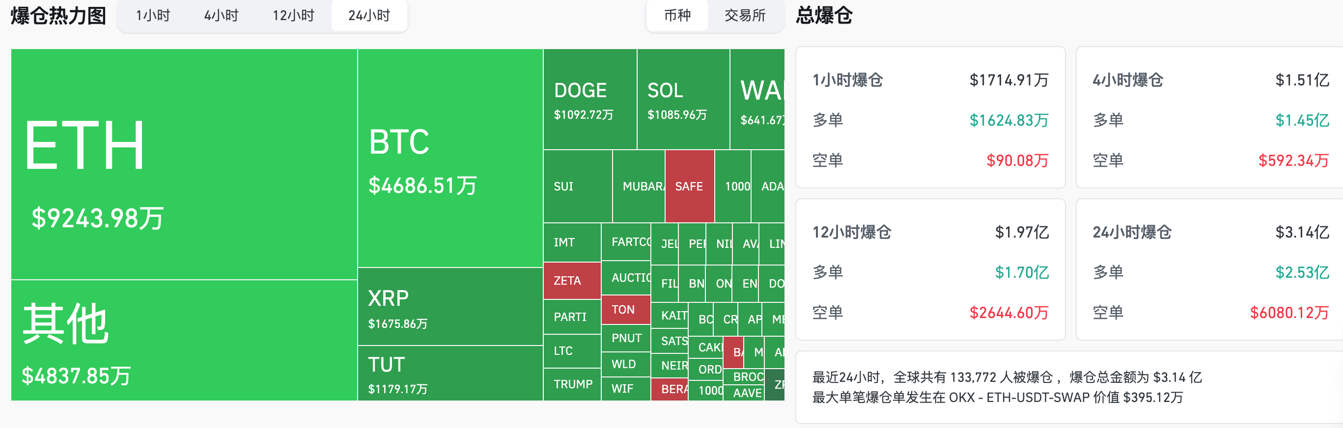 24小时爆仓数据:全球共133772人被爆仓 ,爆仓总金额为3.14亿美元,其BTC爆仓4686万美元、ETH爆仓9243万美元