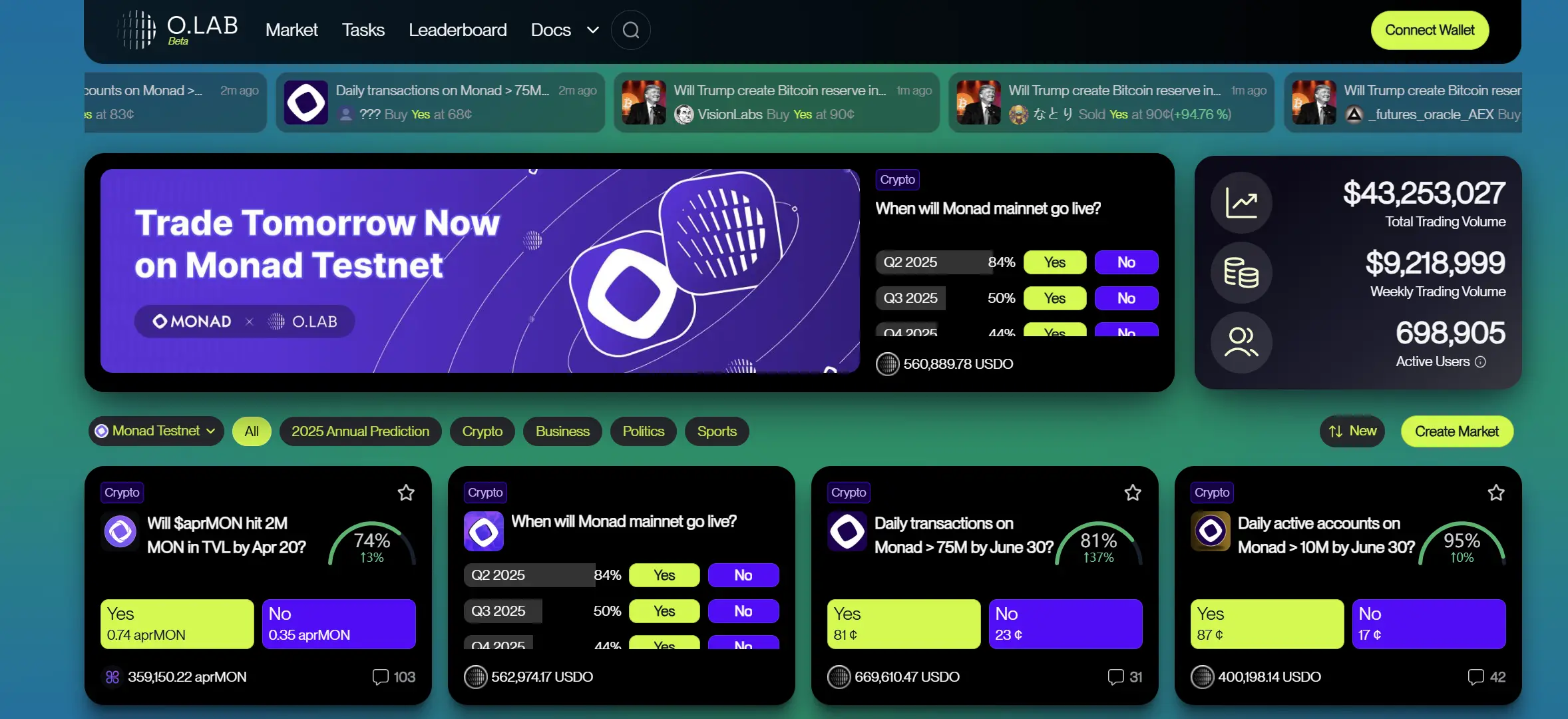 Opinion Labs 是一个部署在 Monad 上的去中心化的预测市场协议,允许任何人基于任意主题创建预测市场,并使用 ERC-20 代币进行交易。用户可以就政治、经济、体育或文化事件等未来走向进行判断,并通过市场表达自己的观点或下注。这些市场是开放的、无需许可的,任何人都可以参与,无需依赖中心化平台或审批流程。