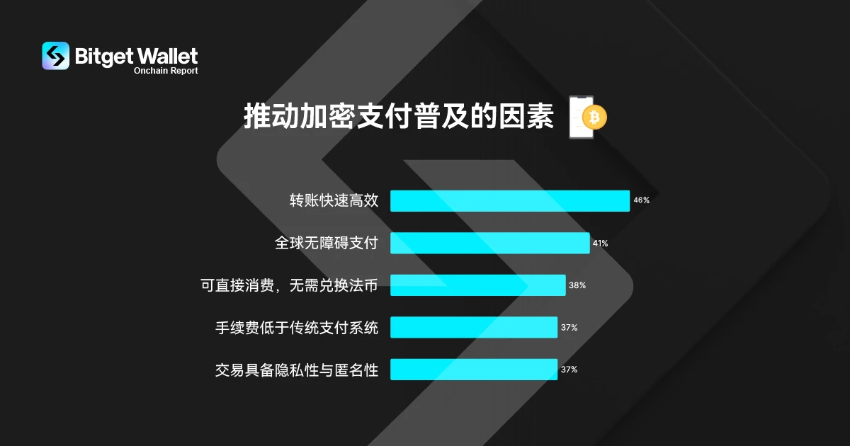速度是采用的首要驱动力, 46% 的受访者认为快速交易是使用加密货币支付的主要原因。 全球可访问性紧随其后, 41% 的用户看重加密货币在跨境交易中的无缝性,尤其是在银行基础设施薄弱的地区。