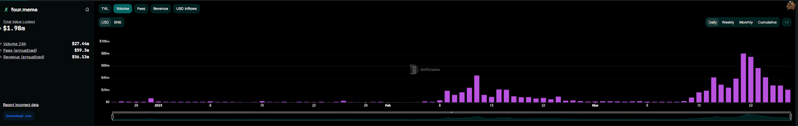 BSC链上热捧的Four.meme,在经历短暂的高峰后,近日也迎来明显的下滑状态。3月27日,Four.meme的交易量仅为2000万美元,相比3月21日的高光时期8000万美元下降了75%。