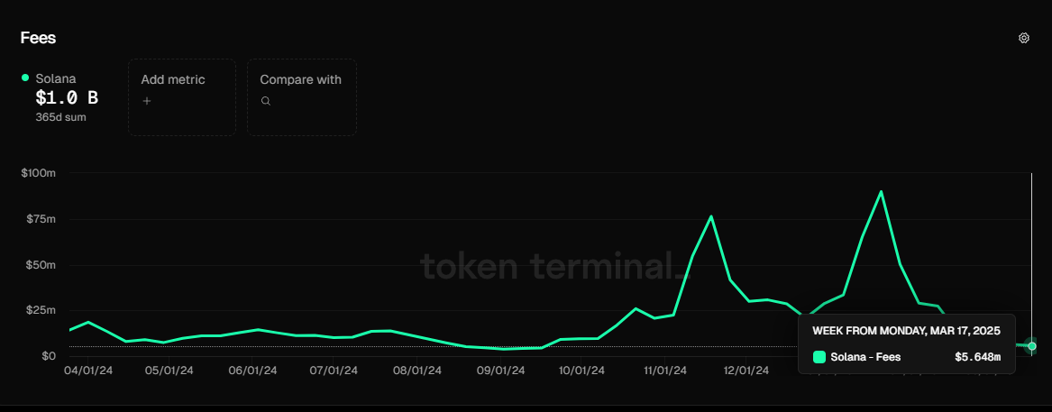 Solana的链上费用从2025年1月的单周最高8991万美元到3月17日降至564万美元,降幅约为93.7%。