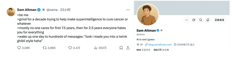 3 月 26 号,OpenAI 首席执行官 Sam Altman 率先加入了这一潮流,他在推特上发了一条自嘲的推文,表示自己意外地被“吉卜力化”,并将个人头像更换为一张吉卜力风格的图像。这条推文迅速吸引了大量关注,成为了社交媒体上的热议话题。