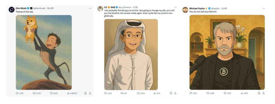 随即,对热点最为敏感的科技和加密圈名人也纷纷效仿,上传了自己的“吉卜力化”头像。例如, 马斯克 在推文中提到“这是今天的主题”,并分享了他的吉卜力风格图像。并且 Binance 的创始人 赵长鹏(CZ) 和微策略(MicroStrategy)创始人 Michael Saylor 等人也纷纷上传了被吉卜力风格渲染过的图像,充分体现了这一趋势的强大感染力。