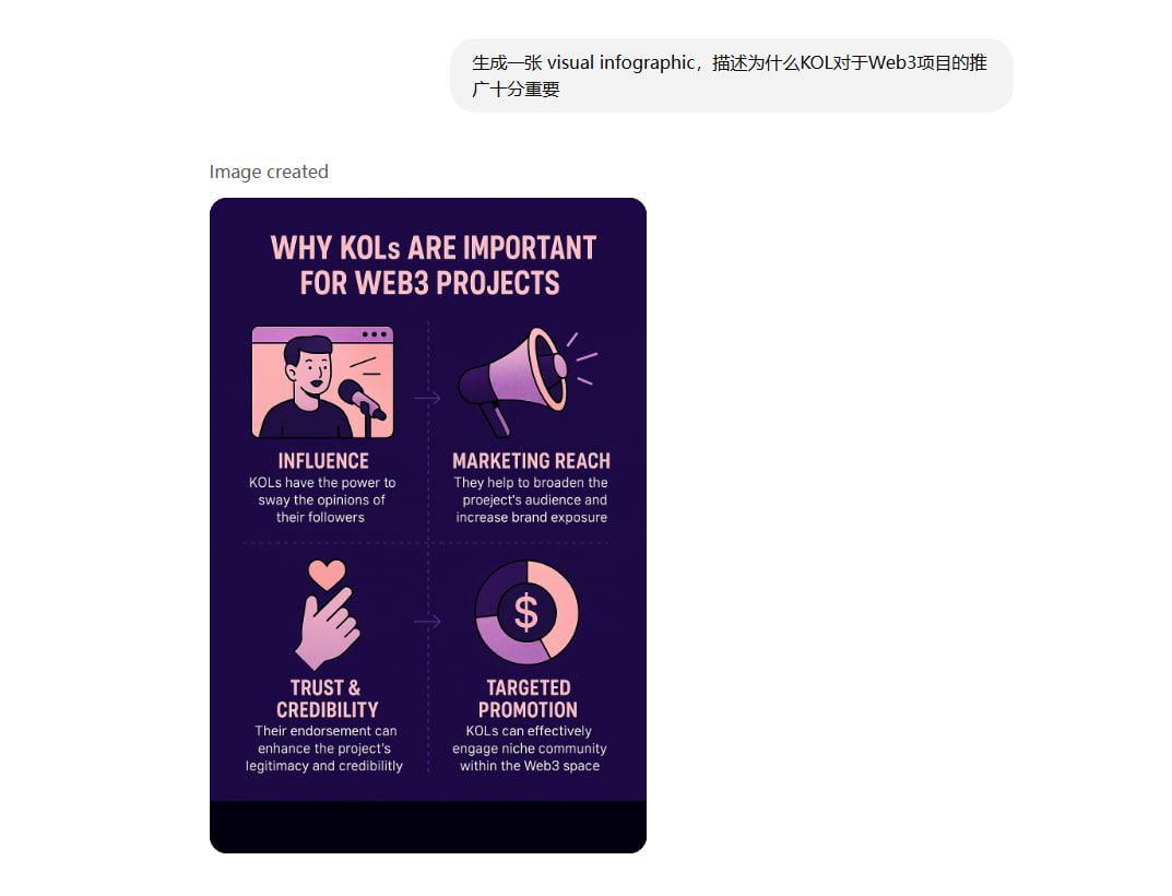 我要解释KOL营销的重要性,我直接说:“生成一张信息图,描述为什么KOL对于Web3项目的推广十分重要”。