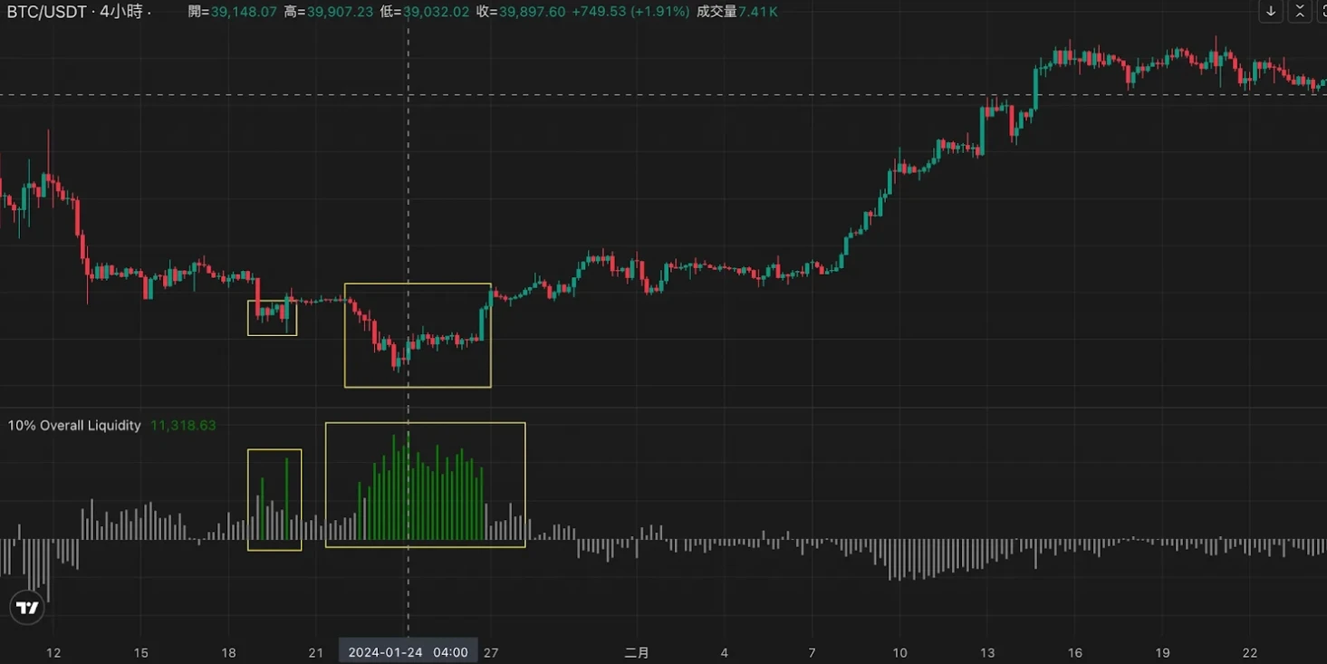 2024/1 复盘:在 38 K-40 K 附近提示了多个买点,随后迎来单边大涨行情