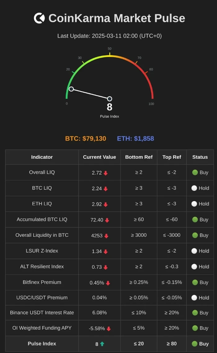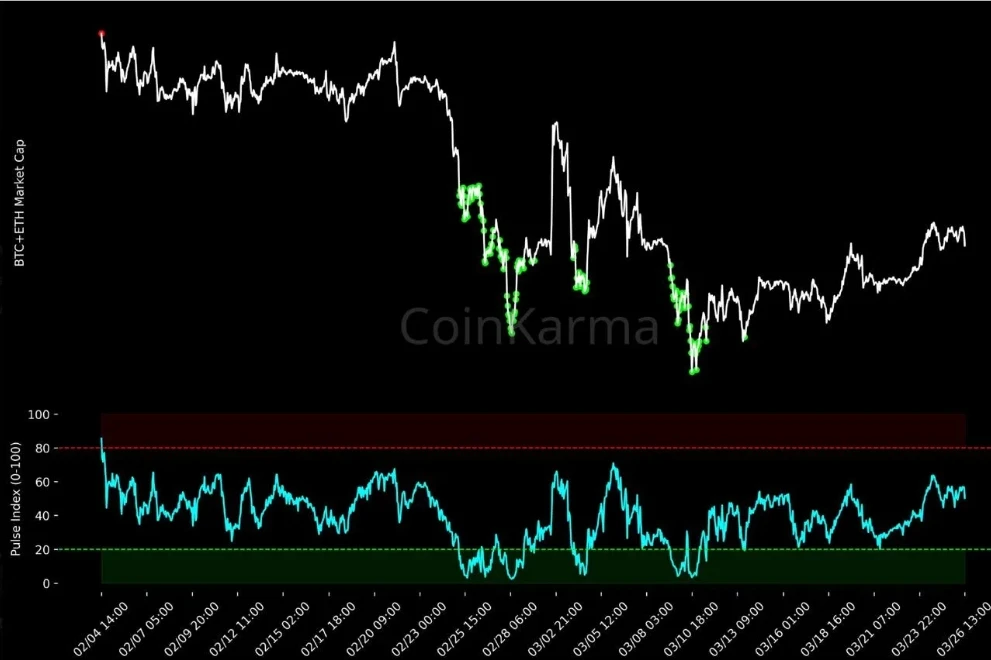 而这仅只是 CoinKarma 提供的众多指标之一,为了让投资者更直观地感知市场,CoinKarma 近期推出了 Market Pulse 指数,将 11 项市场核心数据整合为 0-100 的市场脉动指数。这项指标能帮助投资者快速洞察市场动向,做出高胜率的交易决策。