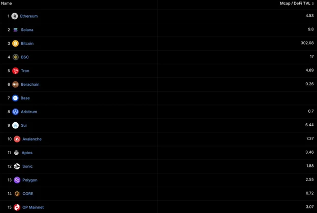 以$BERA 当前 9 亿美元市值来看,Berachain 的市值/DeFi TVL 比率在前 15 大L1中最低。