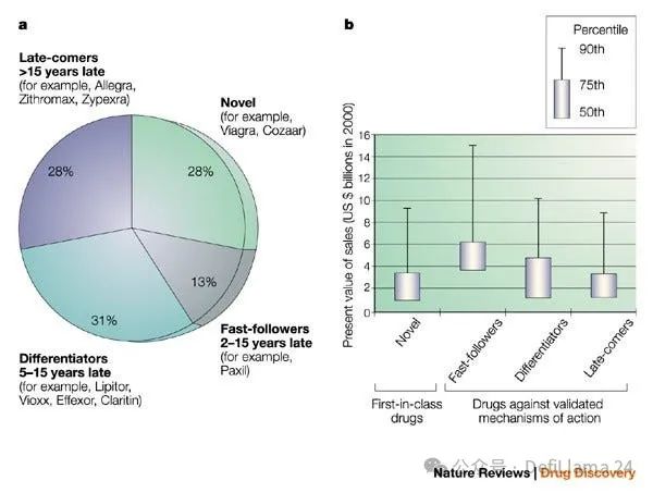 2003 年发表的一项分析指出了“追求最佳”的两大关键优势。首先,这类药物显然具有更低的风险特征,因为其靶点已通过基于人体证据的药物审批得到验证。投资者通常会讨论他们为新靶点假设所承担的“生物学风险”程度。其次,风险差异似乎并未获得相应的回报。事实上,观察 1991 年至 2000 年间推出的药物,大多数重磅炸弹药物都是针对已知靶点开发的,而快速跟进者创造的价值高于风险更高的创新药物。