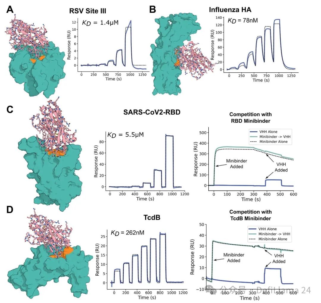 图 2 部分内容:原子精度从头设计单域抗体。结合剂以粉色显示,目标蛋白为青绿色。指定的表位(即抗体结合的区域)以橙色显示。