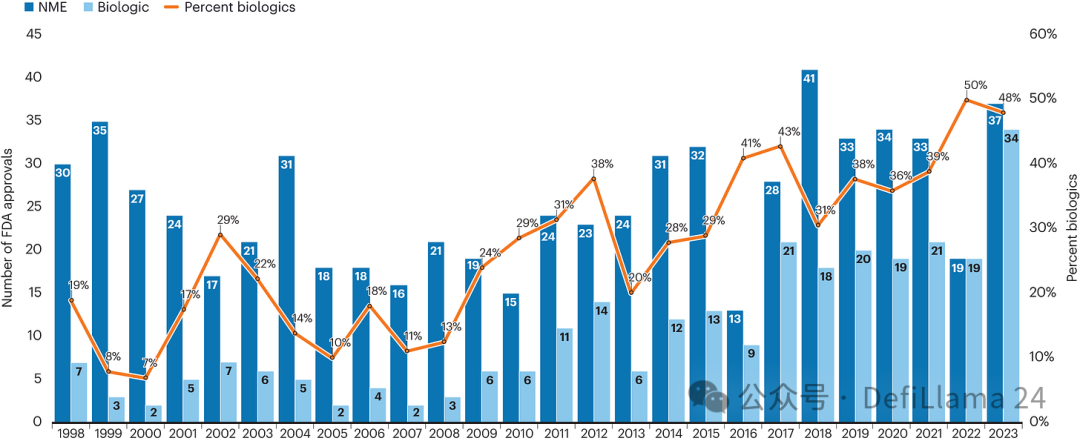 尽管仍有许多怀疑者,生物制品的应用范围仍在医学领域持续扩大,到 2022 年其获批数量首次与小分子药物持平。(我们之前看到的图表。)