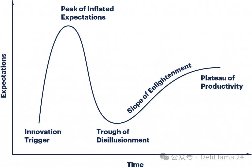 这一演变过程几乎是 Gartner 炒作周期的教科书式范例。最初的"创新触发点"引发了一轮巨大的炒作和兴奋浪潮。当炒作未能立即兑现时,市场便趋于冷静。若初始触发点确有实质内容,随着时间的推移会出现更为渐进式的回升。
