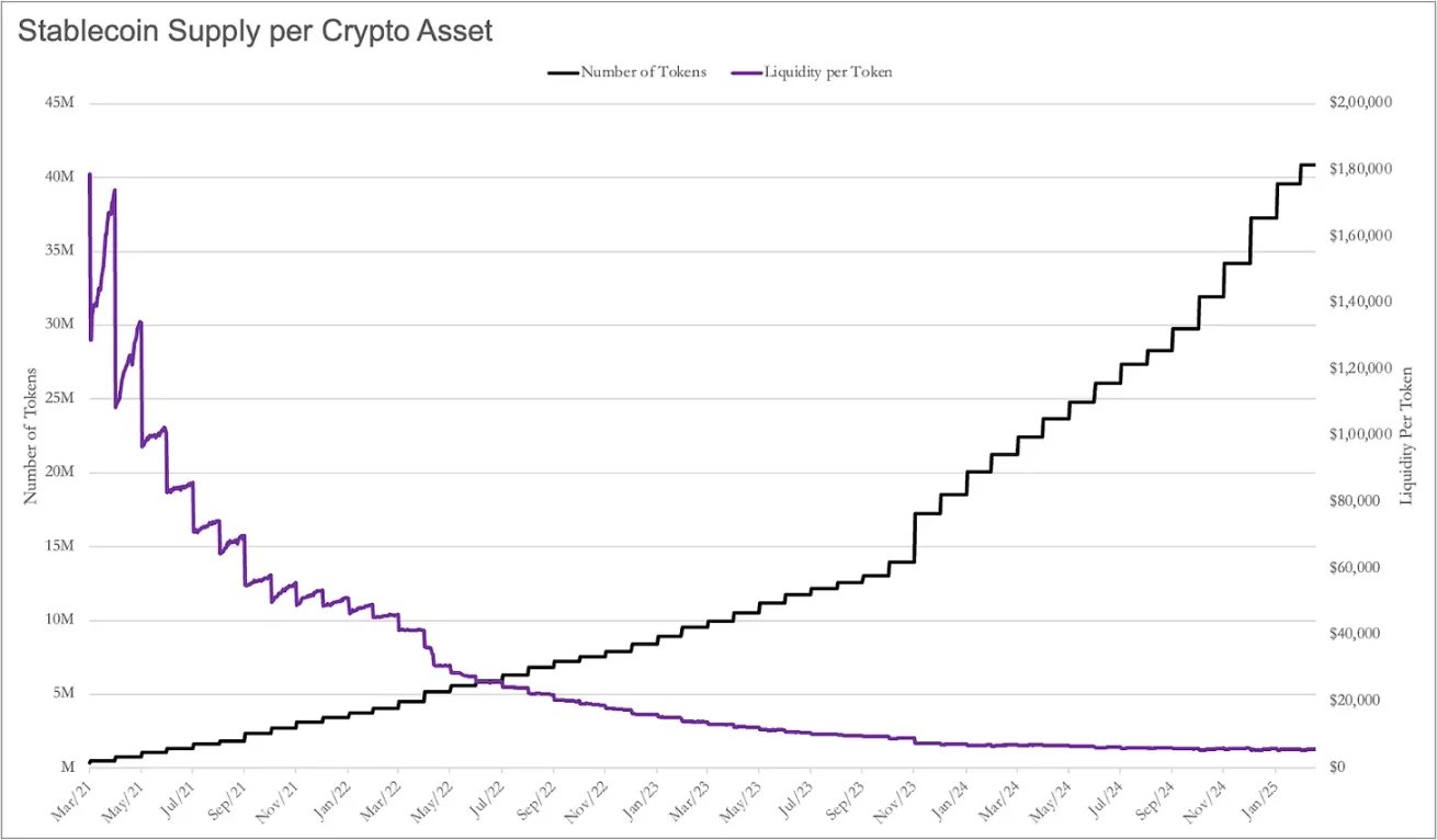 2021 年 3 月,每个加密货币约能享受到价值 180 万美元的稳定币流动性,而到了 2025 年 3 月,这一数字仅为 5500 美元。