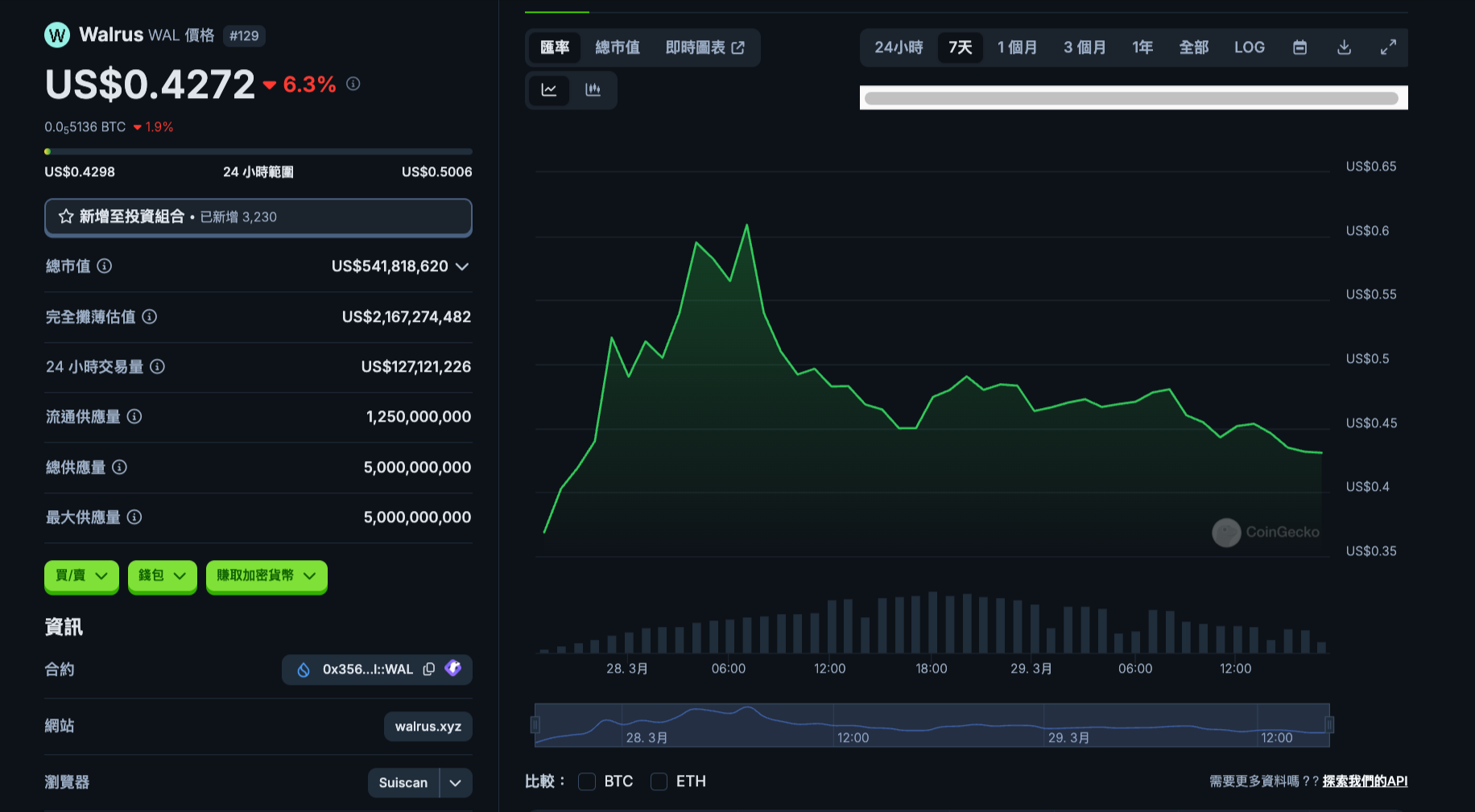 其原生代币 $WAL 在 27 日上架交易所后,从 0.36 美元最高涨超 66% ,28 日创下 0.6 美元的历史高点,撰稿当下回落至 0.4272 美元,近 24 小时下跌 6.3%。